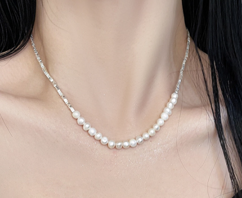 Product detailsElevate your style with this stunning 18K Cube Silver necklace adorned with 19pcs of lustrous 6mm Fresh Water Pearls. The timeless elegance of pearls combined with the sleekness of silver creates a captivating accessory that will effortlessly enhance any outfit. Whether you're attending a formal event or simply want to add a touch of sophistication to your everyday look, this necklace is the perfect choice. Embrace the beauty of pearls and make a statement with this exquisite piece of jewelry.